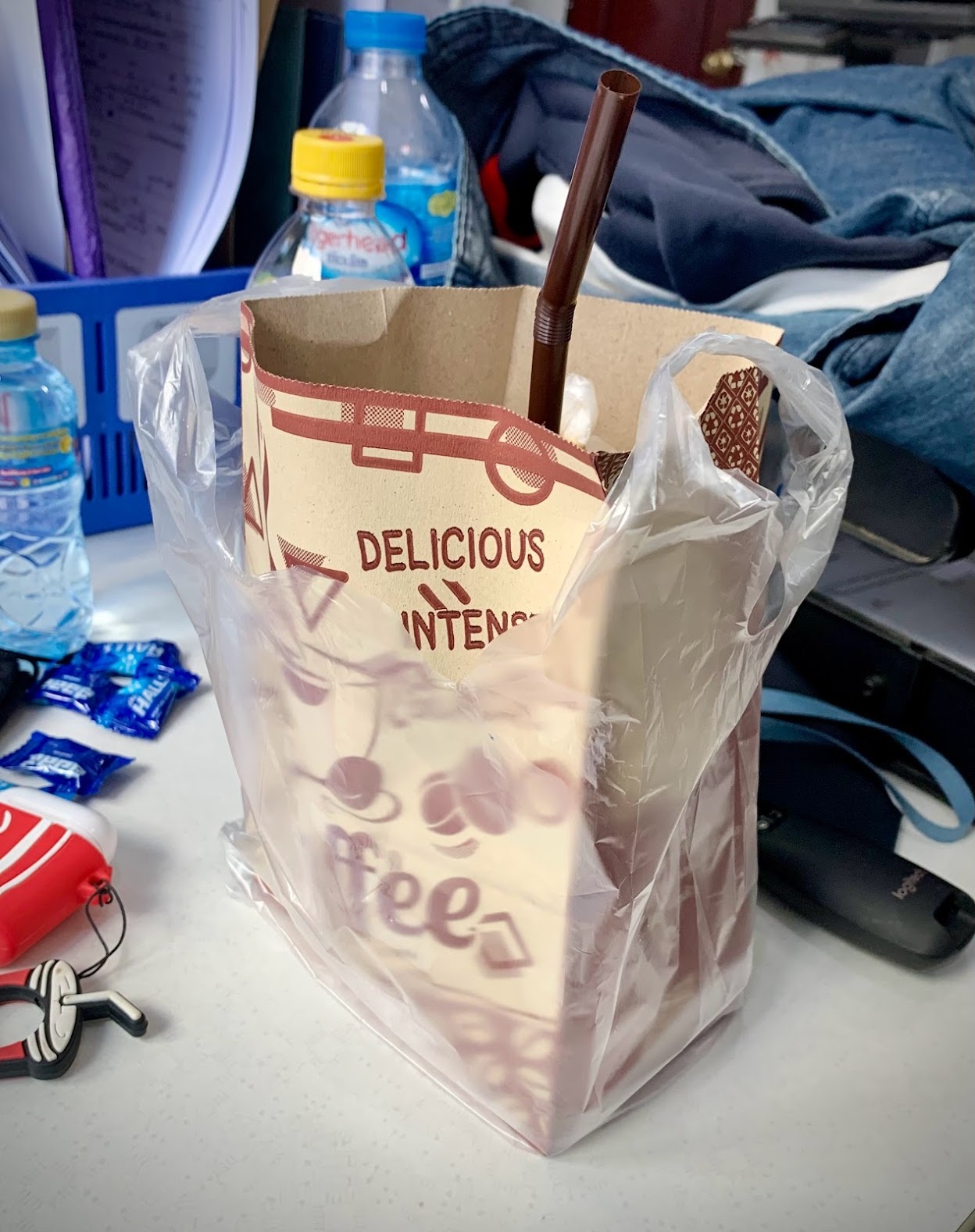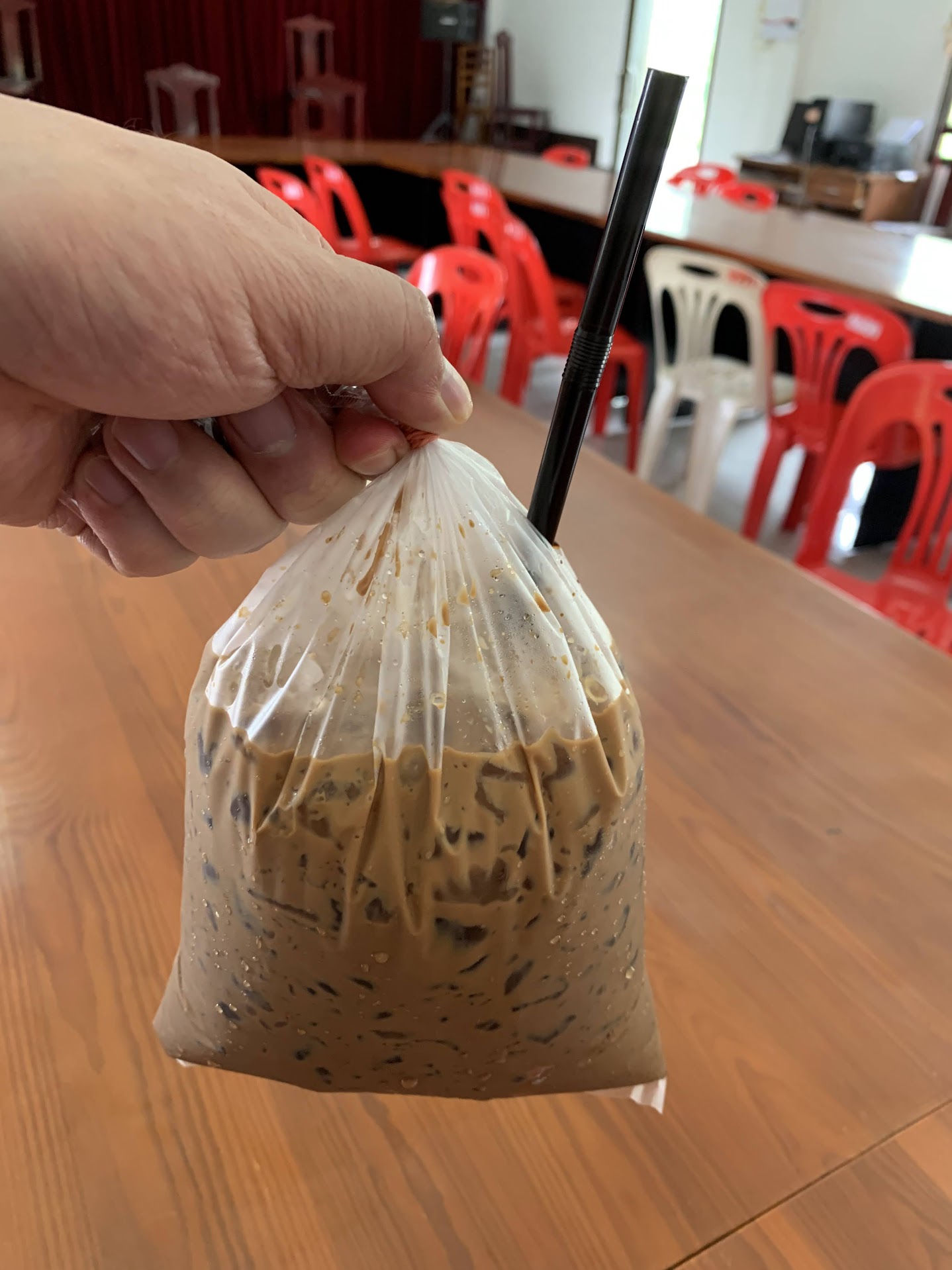 올리앙 외에도, 라오스식 커피가 한 종류 더 있다. 우유와 연유를 넣어 달게 만든 위의 사진과 같은 커피다. 카페놈(ກາເຟນົມ, 우유가 들어간 커피)라고 부른다. 달고쓰고... 아침에 카놈쿠와 함께 한잔 마시는 모닝커피다.