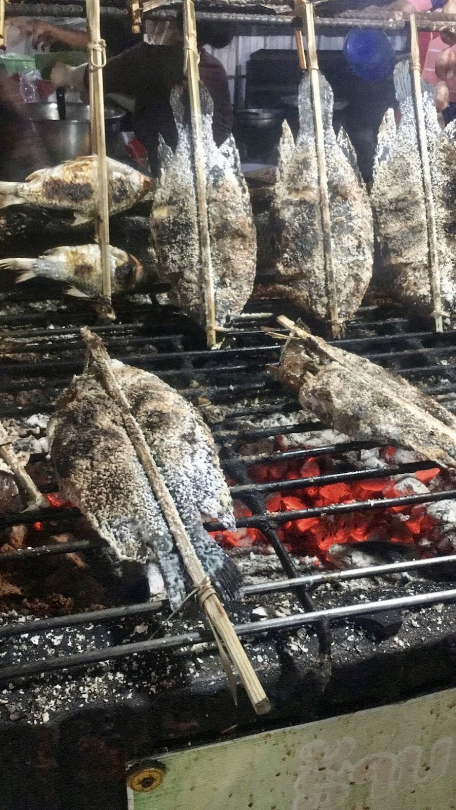 안에는 풀을 넣어서 냄새를 잡고, 겉에는 소금을 많이 뿌려서 숫불에 굽는다.
